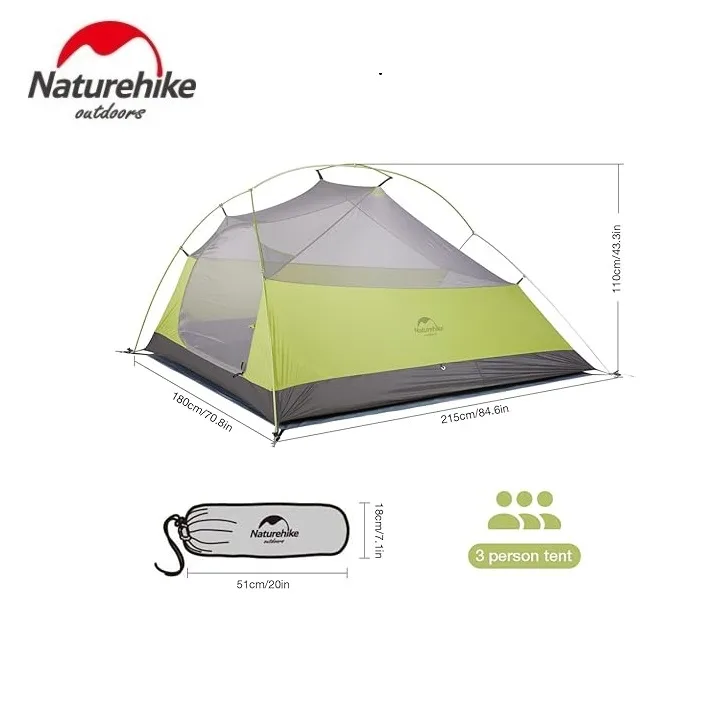 The Naturehike Cloud Up 3-Person Lightweight Backpacking Tent is a versatile and ultralight option for outdoor enthusiasts. Weighing just 5.29lb | 2.4kg, this tent is made from high-quality 20D nylon, ensuring durability, breathability, and skin-friendliness. Its free-standing design allows for quick and easy setup in less than 5 minutes. With dimensions of 857043 in | 215180110 cm and an extra 34-inch | 86.36 centimeters vestibule, it offers ample space for three people. Ideal for all seasons, this double-layer tent provides great ventilation and weather protection.